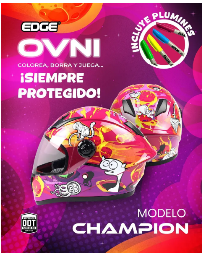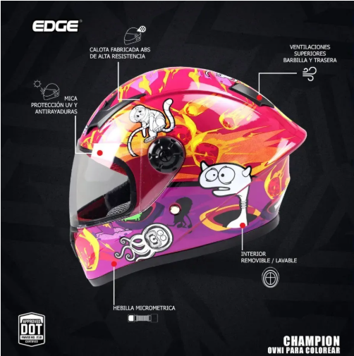 Exprésate como nunca antes con el innovador Casco EDGE Champion OVNI “Para Colorear”! Este casco no solo te ofrece la seguridad y calidad que esperas de EDGE, sino que te invita a ser el artista de tu propio equipo. Con su diseño listo para personalizar, es la elección perfecta para motociclistas que buscan un estilo verdaderamente único y la protección que necesitan en el camino. ¡Tu imaginación es el límite!